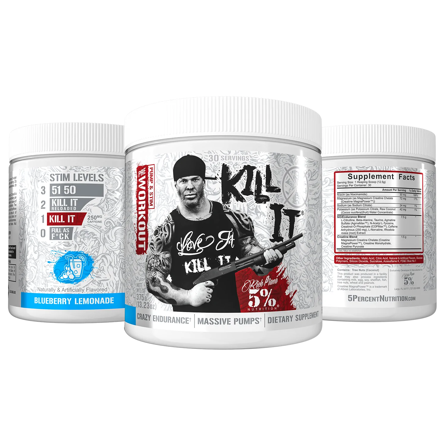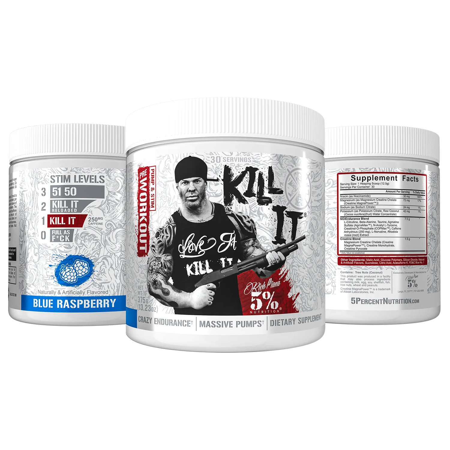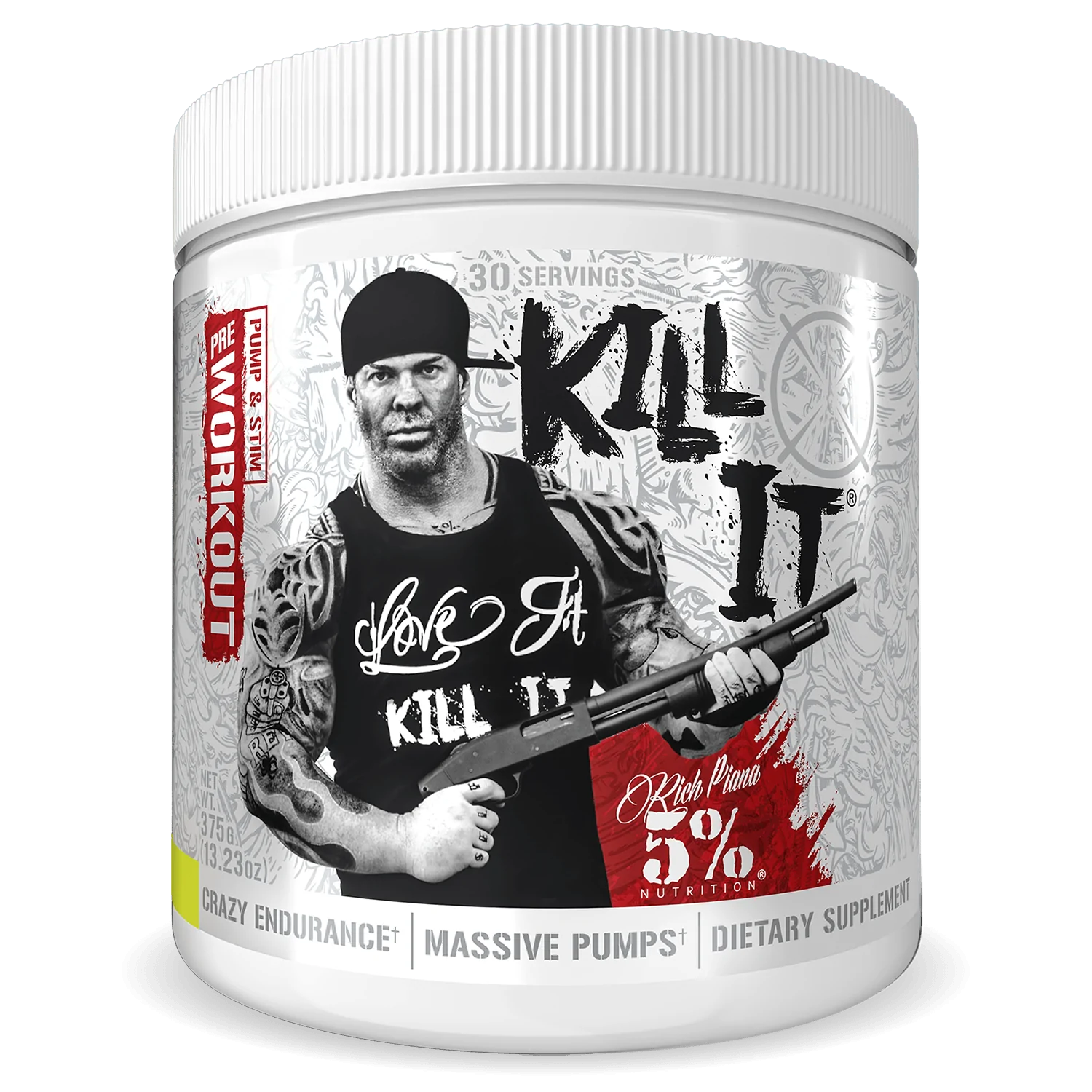 Kill It® is the original Rich Piana 5% Nutrition pre-workout that uses lower Caffeine with more pump and performance ingredients thereby creating a complete all in one pre-workout. This is the reboot of one of Rich's favorite products known for its great flavor and great pump!