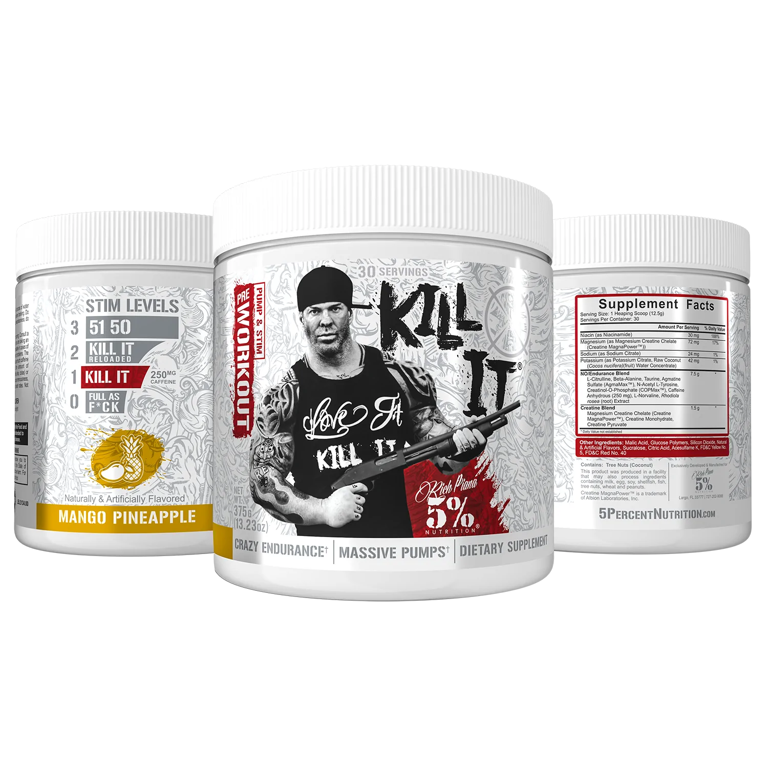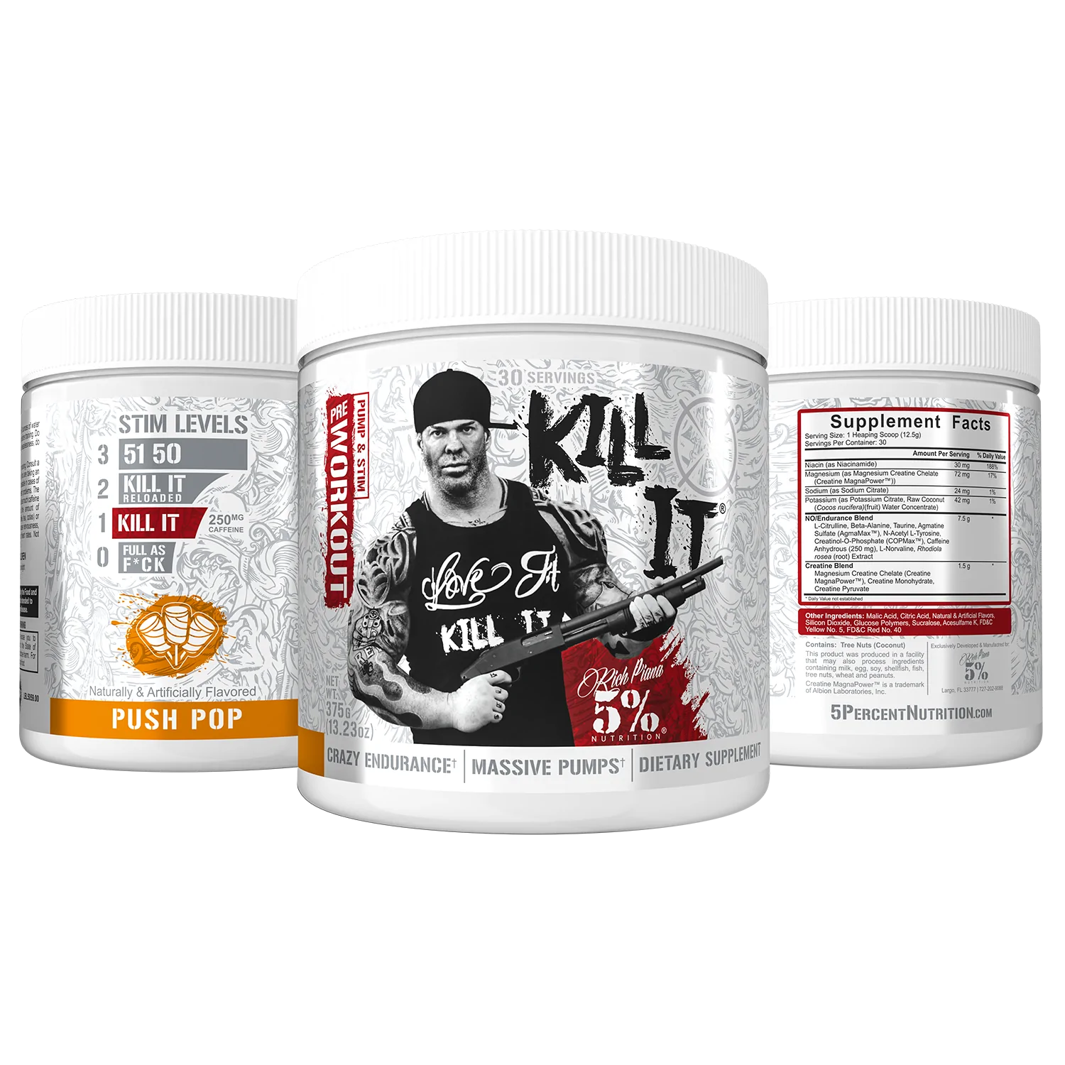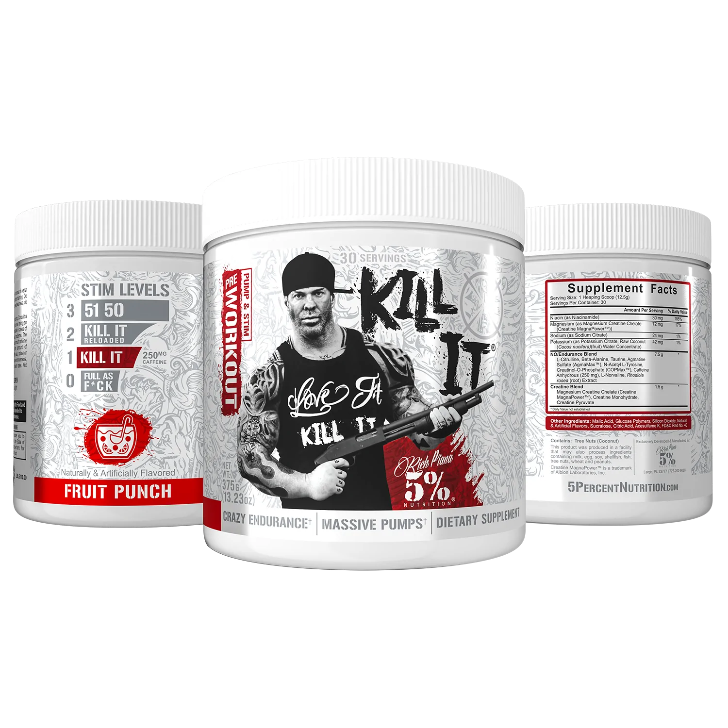 Kill It® is the original Rich Piana 5% Nutrition pre-workout that uses lower Caffeine with more pump and performance ingredients thereby creating a complete all in one pre-workout. This is the reboot of one of Rich's favorite products known for its great flavor and great pump!