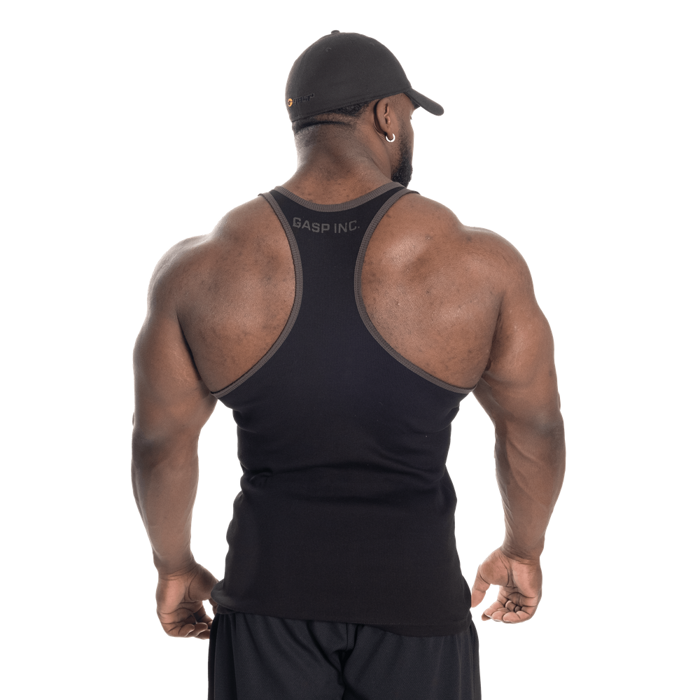The Ribbed T-back is designed with a tighter fit for those who wants something lighter to train in that is not oversized. It’s made out of our popular cotton and lycra rib which allows it to keep its shape through grueling workouts and endless washing cycles. Equipped with a bold GASP print across the chest, a small GASP print in the neck and a tighter fit this tank is designed to the dedicated bodybuilder.