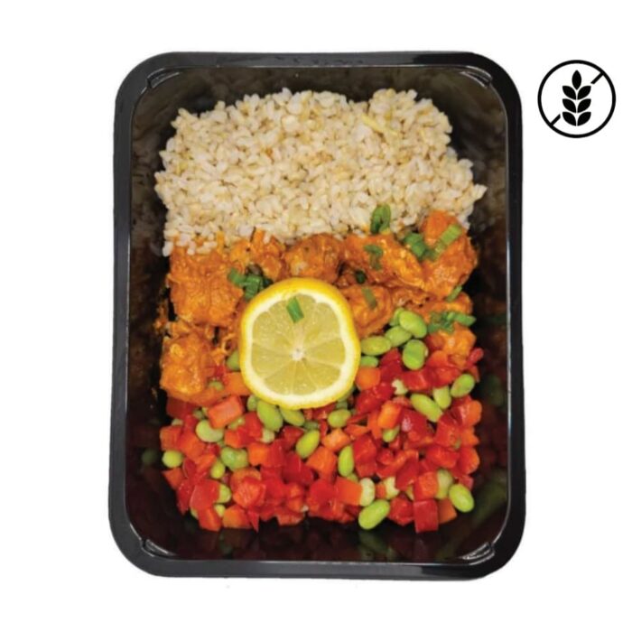Chicken breast, brown rice, green onion, edamame, sweet red pepper, lemon, butter chicken sauce, spices and Himalayan salt