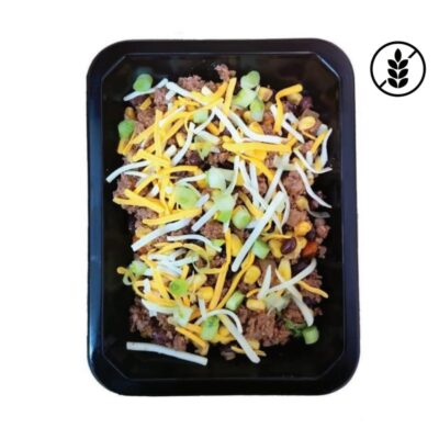 Ingredients: Extra lean ground beef, baked sweet potato fries, black beans, cheese, corn, green onion, tomato sauce, hot sauce, sea salt and spices