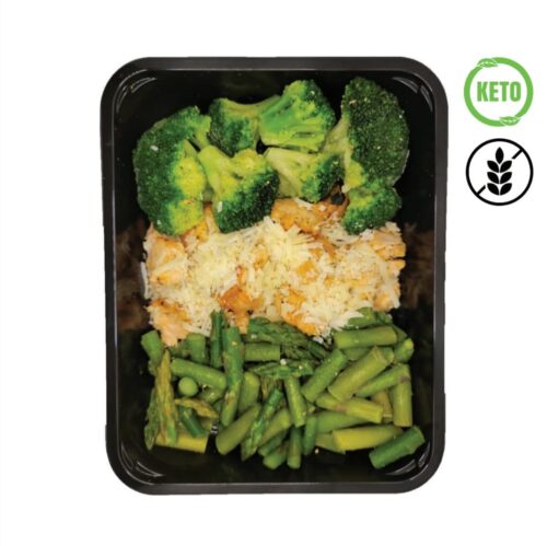 Ingredients: Chicken breast, broccoli, asparagus, parmesan, sea salt, black pepper, spices, and olive oil.